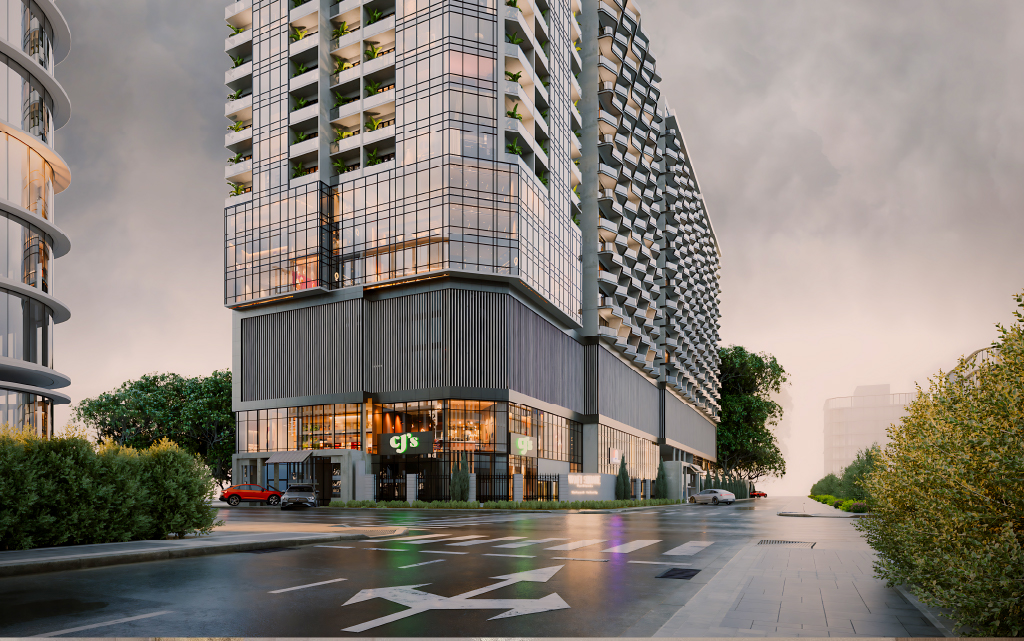 Lifestyle facilities include a gym, kids’ playground, swimming pool, and a bustling commercial podium with a food court and shops.